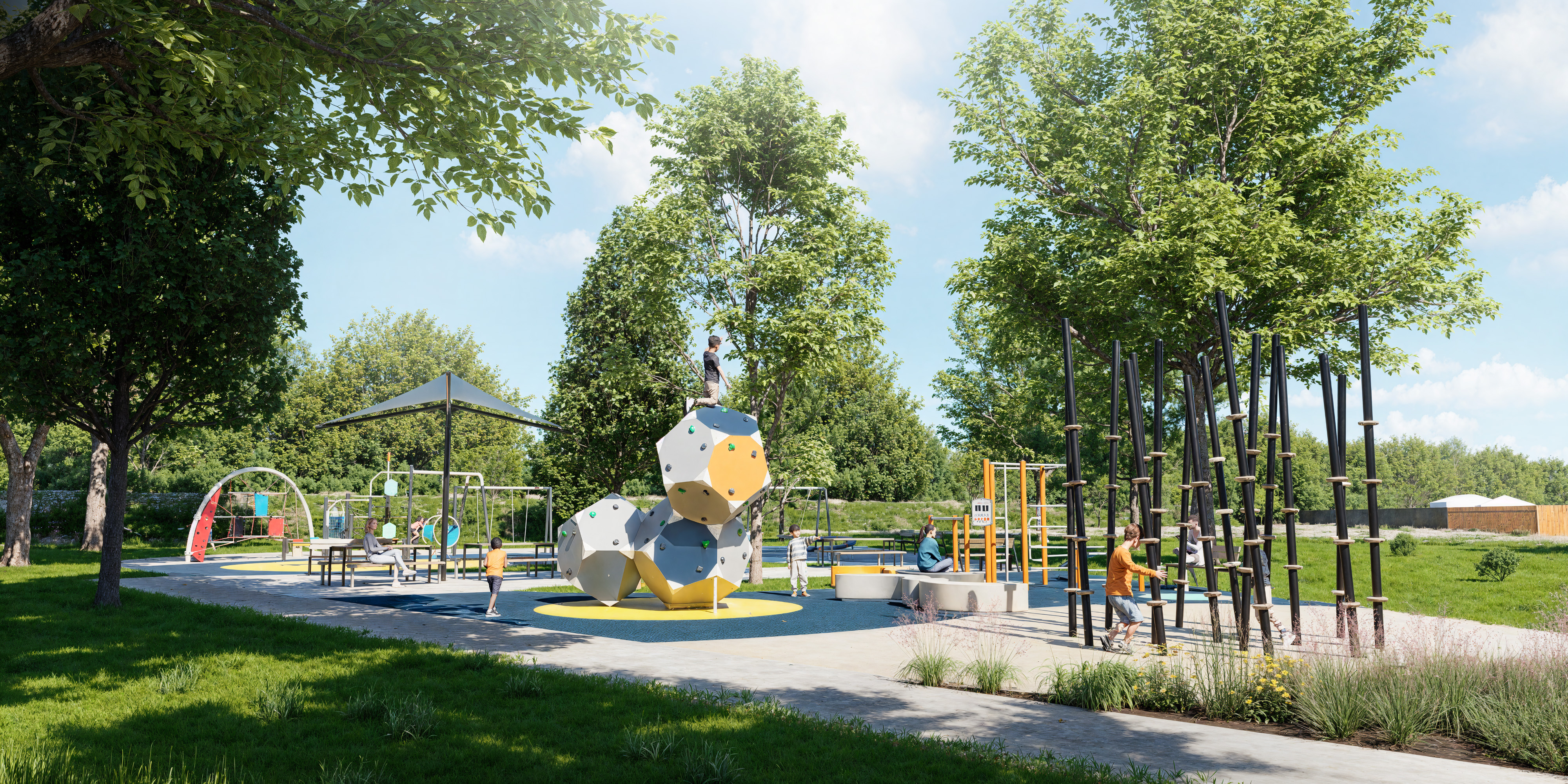 Aires de jeux pour tous les âges (modules, tyrolienne urbaine et filet astral)