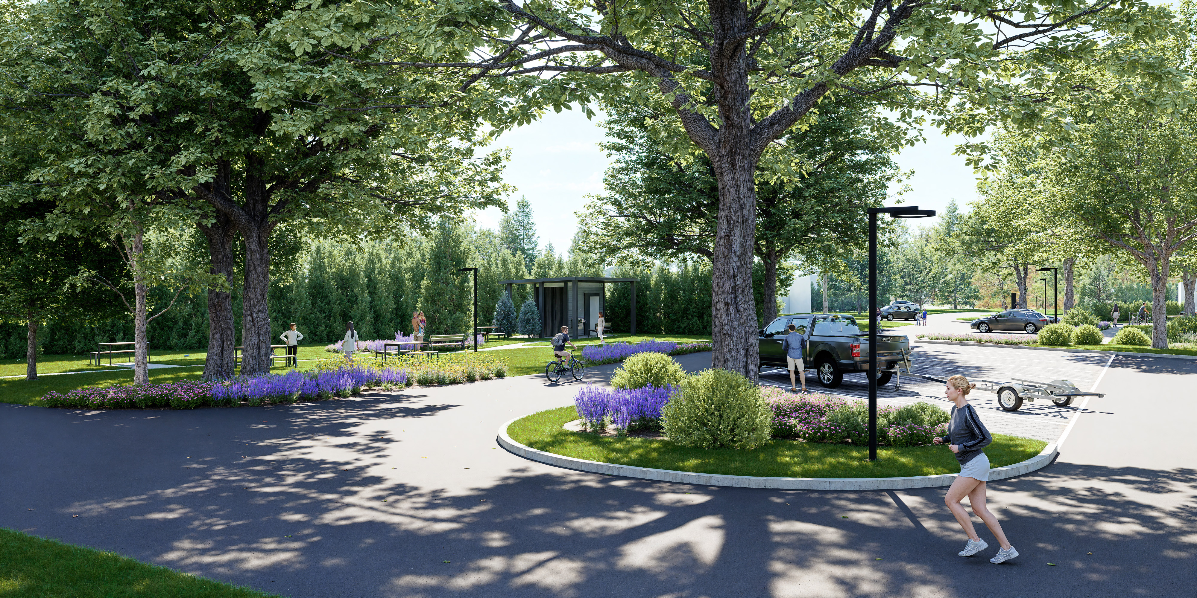 Bloc sanitaire, mobilier urbain, sentiers et aire de pique-nique